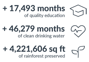 Through a partnership with CleanHub, we calculate and off-set our plastic use for every product sold (including the packaging,) as well as for all full-time employees - equivalent to the world average of 7 kg per person/month. This way our total offset as an organisation is calculated and updated on a monthly basis.